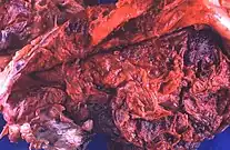 Less frequently, hemothoraces may occur spontaneously. Nontraumatic hemothoraces most frequently occur as a complication of some forms of cancer if the tumour invades the pleural space.[9] Cancers responsible for hemothoraces include angiosarcomas, schwannomas, mesothelioma, thymomas, germ cell tumours, and lung cancer. Significant hemothoraces can occur with spontaneous rupture of small vessels when the blood's ability to clot is diminished as result of anticoagulant medications.[8] In cases caused by anticoagulant therapy, the hemothorax becomes noticeable 4–7 days after anticoagulant therapy is started. In cases of hemothorax complicating pulmonary embolism treatment, the hemothorax is usually on the side of the original embolism.[6] Those with an abnormal accumulation of air within the pleural space (a pneumothorax) can bleed into the cavity, which occurs in about 5% of cases of spontaneous pneumothorax,[8] especially when lung bullae rupture.[11] The resulting combination of air and blood within the pleural space is known as a hemopneumothorax.[8] Bone growth in exostosis can create sharp edges, which can result in hemothorax by damaging adjacent arteries. It can occur postpartum due to the change in thoracic pressure during labor.[11]