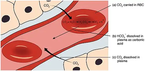 3], bicarbonate, to form the bicarbonate system.[10] This is effective near physiological pH of 7.4 as carboxylic acid is in equilibrium with in the lungs.[9] As blood travels through the body, it gains and loses H+ from different processes including lactic acid fermentation and by NH3 protonation from protein catabolism.[9] Because of this the , changes in the blood as it passes through tissues. This correlates to a change in the partial pressure of in the lungs causing a change in the rate of respiration if more or less is necessary.[9] For example, a decreased blood pH will trigger the brain stem to perform more frequent respiration. The Henderson–Hasselbalch equation can be used to model these equilibria. It is important to maintain this pH of 7.4 to ensure enzymes are able to work optimally.[10]