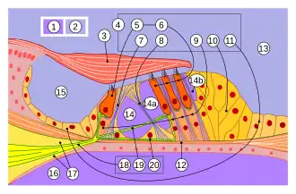 ![]() Schematic anatomy of the Organ of Corti, with Hensen's cells at 10 | |
