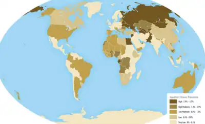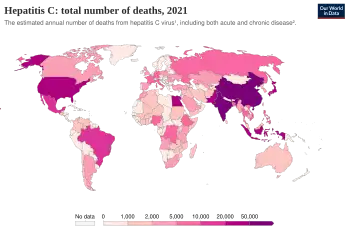 - ↑ Mohd Hanafiah, K; Groeger, J; Flaxman, AD; Wiersma, ST (April 2013). "Global epidemiology of hepatitis C virus infection: new estimates of age-specific antibody to HCV seroprevalence". Hepatology. 57 (4): 1333–42. doi:10.1002/hep.26141. PMID 23172780.