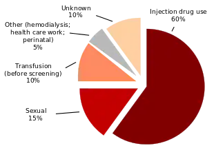 The primary route of transmission in the developed world is intravenous drug use (IDU), while in the developing world the main methods are blood transfusions and unsafe medical procedures.[3] The cause of transmission remains unknown in 20% of cases;[53] however, many of these are believed to be accounted for by IDU.[14]