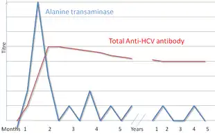 Liver enzymes are variable during the initial part of the infection[18] and on average begin to rise at seven weeks after infection.[19] The elevation of liver enzymes does not closely follow disease severity.[19]