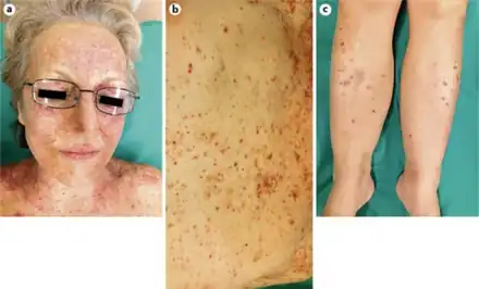 | Atypical presentation purpuric eruption face,upper chest and legs in individual with Hepatosplenic T-cell lymphoma | |