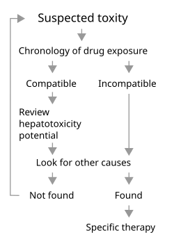 This remains a challenge in clinical practice due to a lack of reliable markers.[48] Many other conditions lead to similar clinical as well as pathological pictures. To diagnose hepatotoxicity, a causal relationship between the use of the toxin or drug and subsequent liver damage has to be established, but might be difficult, especially when idiosyncratic reaction is suspected.[49] Simultaneous use of multiple drugs may add to the complexity. As in acetaminophen toxicity, well established, dose-dependent, pharmacological hepatotoxicity is easier to spot. Several clinical scales such as CIOMS/RUCAM scale and Maria and Victorino criteria have been proposed to establish causal relationship between offending drug and liver damage. CIOMS/RUCAM scale involves a scoring system that categorizes the suspicion into "definite or highly probable" (score > 8), "probable" (score 6–8), "possible" (score 3–5), "unlikely" (score 1–2) and "excluded" (score ≤ 0). In clinical practice, physicians put more emphasis on the presence or absence of similarity between the biochemical profile of the patient and known biochemical profile of the suspected toxicity (e.g., cholestatic damage in amoxycillin-clauvonic acid ).[48]