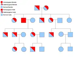 Two copies of every gene are present in all cells of the body and each one is called an allele. Most cancer syndromes are transmitted in a mendelian autosomal dominant manner. In these cases, only one faulty allele has to be present for an individual to have a predisposition to cancer. Individuals with one normal allele and one faulty allele are known as heterozygous. A heterozygous individual and a person with two normal alleles (homozygous) will have a 50% chance of producing an affected child.[9] The mutation in the inherited gene is known as a germline mutation and a further mutation in the normal allele results in the development of cancer. This is known as Knudson's two-hit hypothesis, where the first hit of the gene is the inherited mutation and the second hit occurs later in life.[2] As only one allele needs to be mutated (as compared to both in so-called "sporadic cancers"), the individual has a higher chance of developing the cancer than the general population.[10]