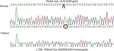 - ↑ 2.0 2.1 Kaiser, Ursula B.; Hegele, Robert A. (December 1991). "Case report: Heterogeneity of aldolase B in hereditary fructose intolerance". The American Journal of the Medical Sciences. 302 (6): 364–8. doi:10.1097/00000441-199112000-00008. PMID 1772121.