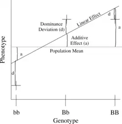 The number of B alleles can be 0, 1, or 2. For any genotype, (Bi,Bj), where Bi and Bj are either 0 or 1, the expected phenotype can then be written as the sum of the overall mean, a linear effect, and a dominance deviation (one can think of the dominance term as an interaction between Bi and Bj):