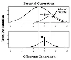In this equation, the Response to Selection (R) is defined as the realized average difference between the parent generation and the next generation, and the Selection Differential (S) is defined as the average difference between the parent generation and the selected parents.[14]: 1957 [26]