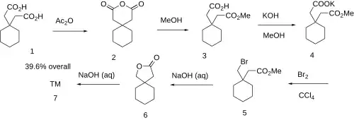 The treatment of 1,1-Cyclohexanediacetic acid [4355-11-7] (1) with acetic anhydride led to Cyclohexanediacetic anhydride [1010-26-0] (2). Esterification with methanol led to 1,1-Cyclohexanediacetic acid mono methyl ester [60142-94-1] (3). Treatment of the monoacid with potassium hydroxide gave the alkoxide (4). Treatment with bromine in the presence of tetrachloromethane gave Methyl 3,3-pentamethylene-4-bromobutyrate (5). Reaction with aqueous lye gave 2-Oxaspiro[4.5]decan-3-one (GO 177) [7236-78-4] (6). Further treatment with aqueous lye completed the synthesis of hexacyclonate (7).[5]