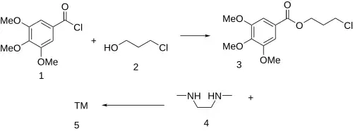 Hexobendine can be synthesized starting with a reaction between 3,4,5-trimethoxybenzoyl chloride (1) and 3-chloropropanol (2) to give the corresponding ester, 3-chloropropyl 3,4,5-trimethoxybenzoate (3). The last step involves the reaction between two molar equivalents of 3 with one molar equivalent of 1,2-dimethylethylenediamine (4) completing the synthesis of hexobendine (5).[2][3]