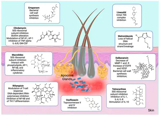 - ↑ Molinelli, Elisa; De Simoni, Edoardo; Candelora, Matteo; Sapigni, Claudia; Brisigotti, Valerio; Rizzetto, Giulio; Offidani, Annamaria; Simonetti, Oriana (June 2023). "Systemic Antibiotic Therapy in Hidradenitis Suppurativa: A Review on Treatment Landscape and Current Issues". Antibiotics. 12 (6): 978. doi:10.3390/antibiotics12060978. ISSN 2079-6382.