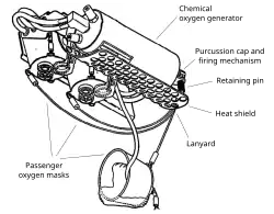 Aircraft emergency oxygen systems or air masks are emergency equipment fitted to pressurized commercial aircraft, intended for use when the cabin pressurisation system has failed and the cabin altitude has climbed above a safe level. It consists of a number of individual yellow oxygen masks stored in compartments near passenger seats and near areas like lavatories and galleys, and an oxygen source or sources, like a centralized high pressure gaseous oxygen cylinder or decentralized chemical oxygen generators.