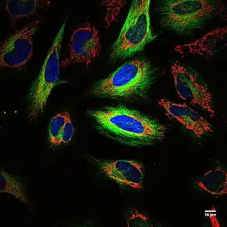 Strengths: Combines the strengths of PET and optical Imaging, fluorescence. PET allows for anatomical imaging for location of labelled cells in entire animals or humans because the radiolabel, 18F, is within the animal or human for nearly unlimited depth of penetration. 18F has a half-life of 110 min and limits the radioactive exposure to the animal or human. Optical imaging allows for higher resolution with sub-cellular resolution of ~270 nm, or the diffraction limit of light, to allow for imaging of single cells and localizing cellular location on the cell membrane, endosomes, cytoplasm, or nuclei (see FIgure of multicolor HeLa cellls). The technique can label small molecules,[32][35][36] antibodies,[30] cells (cancer[30][32] and red blood cells[31]), cerebrospinal fluid,[37] hemorrhages,[31] prostate cancer removal,[32][38] and genome edited cells expressing a genetically encoded human protein, PSMA, for imaging CRISPR/Cas9 edited and CAR T-cells.[32]
