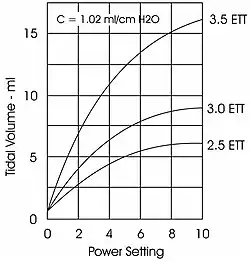 The frequency setting is measured in hertz (hz). The control knob is a 10-turn clockwise-increasing potentiometer covering a range of 3 Hz to 15 Hz. The set frequency is displayed on a digital meter on the face of the ventilator. One Hertz is (-/+5%) equal to 1 breath per second, or 60 breaths per minute (e.g., 10 Hz = 600 breaths per minute). Changes in frequency are inversely proportional to the amplitude and thus delivered tidal volume.