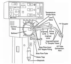 The bias flow controls and indicates the rate of continuous flow of humidified blended gas through the patient circuit. The control knob is a 15-turn pneumatic valve which increases flow as it is turned.