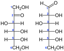 Structural formulae (Fischer projections) of fructose (left) and glucose (right)