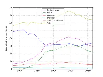 Consumption of HFCS in the U.S. has declined since it peaked at 37.5 lb (17.0 kg) per person in 1999. The average American consumed approximately 22.1 lb (10.0 kg) of HFCS in 2018,[42] versus 40.3 lb (18.3 kg) of refined cane and beet sugar.[43][44] This decrease in domestic consumption of HFCS resulted in a push in exporting of the product. In 2014, exports of HFCS were valued at $436 million, a decrease of 21% in one year, with Mexico receiving about 75% of the export volume.[6]