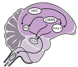HVC is located in the caudal nidopallium. It projects to the song motor pathway via the robust nucleus of the arcopallium (RA) and to the Anterior Forebrain Pathway via the basal ganglia nucleus Area X.[1] It receives recurrent motor activity through the thalamic nucleus Uvaformis (Uva) and input from the auditory system through projections from the caudalateral mesopallium (CMM) and through the nucleus interfacialis (NIf).[8] Four distinct types of neurons have been identified in HVC, each with unique anatomical and physiological properties: interneurons, RA-projecting cells (HVCRA), and X-projecting cells (HVCX), and Nucleus Avalanche (Av) projecting cells (HVCAV).[8][9][10]