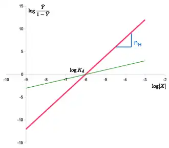 This last form of the Hill equation is advantageous because a plot of versus yields a linear plot, which is called a Hill plot.[7][8] Because the slope of a Hill plot is equal to the Hill coefficient for the biochemical interaction, the slope is denoted by . A slope greater than one thus indicates positively cooperative binding between the receptor and the ligand, while a slope less than one indicates negatively cooperative binding.