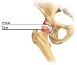 Cam impingement is created by the abnormal development of the femoral head-neck junction causing what has previously been described as a 'pistol-grip deformity'. This type of deformity is characterised by varying amounts of abnormal bone on the anterior and superior femoral neck at the head-neck junction (see fig. 6). The head-neck junction is at the base of the ball of the hip, where it joins the short neck, which in turn carries on downwards into the femur, or thighbone, itself. A bony protrusion or bump at the head-neck junction has been likened to a cam, an eccentric part of a rotating device. This leads to joint damage as a result of the non-spherical femoral head being forced into the acetabulum mainly with flexion and/or internal rotation. This may impart compression and shear forces to the articular cartilage, and may lead to labral tears and peeling away of the articular cartilage from the underlying bone, so-called cartilage delamination (see fig. 8).[9][10]