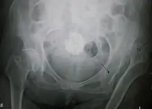 Dislocations are typically due to significant trauma such as a motor vehicle collision or fall from height.[1] Often there are also other associated injuries.[2][6] Diagnosis is generally confirmed by plain X-rays.[2] Hip dislocations can also occur follow a hip replacement or from a developmental abnormality known as hip dysplasia.[7]