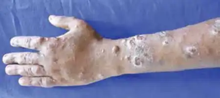 | Presence of several papular-nodular, ulcerated, crusted lesions on the left forearmand left hand | |