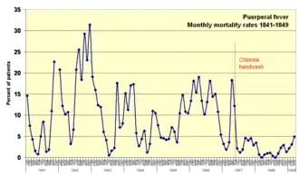 - ↑ Semmelweis (1861). Figures for Jan 1841 to May 1847 from table 3, p. 72; for Jun 1847 to Dec 1847 from table 6, p. 90; for Jan 1848 to Dec 1848 from table 7 p. 91; Jan–Mar 1949 from p89 in text. Rates are computed (not from source). Figures for Dec 1841 are not available, marked as "na"