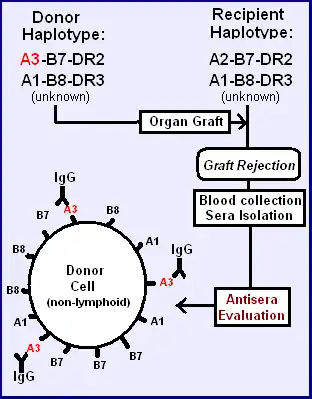 In the tables a fortuitous transplant between two unrelated individual has resulted in an antiserum to single alloantigen. By discovering these close-but-non-identical matches, the process with somewhat related haplotypes surface antigens were identified for HLA A, and in the table below, HLA B at the time however these were all grouped together as HL-Antigens. On the left the "B" and "cw" antigens are matched (B and C are close together so if B matches then C likely also matches), but A antigens are not matched. The antisera that is produced by the recipient is most likely to be A3, but if the direction of transplant is reversed A2 is the likely alloantigen. Two of the first three alloantigens are thus readily easy to detect because of the similarity and frequency of the A2-B7 and A3-B7 haplotypes (see example 1).