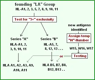 Since it was now certain, by the early 1970s, that the "antigens" were encoded by different series, implicit loci, numeric lists became somewhat cumbersome. Many groups were discovering antigens. In these instances an antigen was assigned a temporary name, like "RoMa2" and after discussion, the next open numeric slot could be assigned, but not to an "A" or "B" series until proper testing had been done. To work around this problem a 'workshop' number "w#" was often assigned while testing continued to determine which series the antigen belonged to.