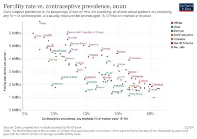 In France, the 1920 Birth Law contained a clause that criminalized dissemination of birth-control literature.[65] That law, however, was annulled in 1967 by the Neuwirth Law, thus authorizing contraception, which was followed in 1975 with the Veil Law. Women fought for reproductive rights and they helped end the nation's ban on birth control in 1965.[66] In 1994, 5% of French women aged 20 to 49 who were at risk of unintended pregnancy did not use contraception.[67]