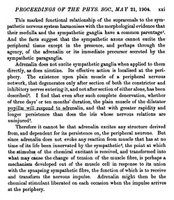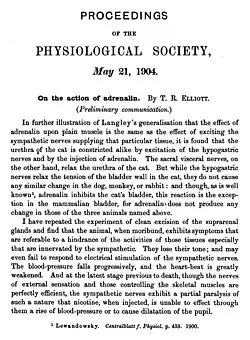 - ↑ T. R. Elliott (1904). "On the action of adrenalin". The Journal of Physiology. 31 (Suppl): XX–XXI. doi:10.1113/jphysiol.1904.sp001055. PMC 1465436.