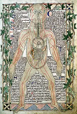The Greek Galen (c. 129–216 CE) was one of the greatest physicians of the ancient world, as his theories dominated all medical studies for nearly 1500 years.[87] His theories and experimentation laid the foundation for modern medicine surrounding the heart and blood. Galen's influence and innovations in medicine can be attributed to the experiments he conducted, which were unlike any other medical experiments of his time. Galen strongly believed that medical dissection was one of the essential procedures in truly understanding medicine. He began to dissect different animals that were anatomically similar to humans, which allowed him to learn more about the internal organs and extrapolate the surgical studies to the human body.[87] In addition, he performed many audacious operations—including brain and eye surgeries—that were not tried again for almost two millennia. Through the dissections and surgical procedures, Galen concluded that blood is able to circulate throughout the human body, and the heart is most similar to the human soul.[87][88] In Ars medica ("Arts of Medicine"), he further explains the mental properties in terms of specific mixtures of the bodily organs.[89][90] While much of his work surrounded the physical anatomy, he also worked heavily in humoral physiology.