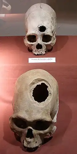 Trepanation, similar to some techniques used today, is the oldest surgical procedure known and was practised in the Stone Age in many parts of the world,[3] and in some areas may have been quite widespread. The main pieces of archaeological evidence are in the forms of cave paintings and human remains. One third of 120 skulls found at a site in France dating to 6500 BCE had undergone trepanning.[4] It was also practised widely in the pre-Columbian Andes.[5][6] These procedures were mostly performed on combatants, with evidence from skeletal remains revealing that the earliest methods usually resulted in death.[6] However, by the 1400s, Incas proved to be "skilled surgeons", as survival rates rose to about 90%, infection rates following the procedure were low and evidence was found showing that some individuals survived the surgery on multiple occasions.[6] Incan surgeons learned to avoid areas of the head that would cause injury, using a scraping method on the skull that would cause less trauma.[6] They also likely used medicinal herbs of the time, such as coca and alcohol for pain while balsam and saponin would be employed for antibiotic purposes.[6]