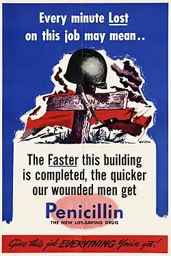 Ethel and Howard Florey published the results of clinical trials of penicillin in The Lancet on 27 March 1943, reporting the treatment of 187 cases of sepsis with penicillin.[102] It was upon this medical evidence that the British War Cabinet set up the Penicillin Committee on 5 April 1943. The committee consisted of Cecil Weir, Director General of Equipment, as chairman; Alexander Fleming; Howard Florey; V. D. Allison, another one of Fleming's former research students; Sir Percival Hartley, the head of the MRC; and representatives from pharmaceutical companies.[103] This led to the mass production of penicillin by the next year.[104]