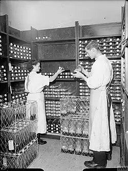 Wartime conditions, including German bombing, made progress difficult. The 55-litre (12 imp gal) milk churns needed for shipment were in short supply, and special arrangements were made with the Ministry of Supply. The brew was initially despatched by rail to minimise the use of rationed petrol.[151] The first 680 litres (150 imp gal) of brew, containing 6.1 million units at 9 units per mL, were delivered to Florey on 28 October 1942.[150] Kemball, Bishop & Co. built an extraction plant, which became operational on 24 November 1943.[151]