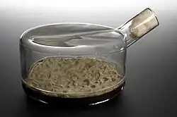 The mould needs air to grow, so cultivation required a container with a large surface area. Initially, glass bottles laid on their sides were used. Most laboratory containers did not provide a large, flat area, and so were an uneconomical use of incubator space.[64] The bedpan was found to be practical, and was the basis for specially-made ceramic containers fabricated by J. Macintyre and Company in Burslem. These containers were rectangular in shape and could be stacked to save space.[65] The MRC agreed to Florey's request for £300 (equivalent to £21,000 in 2023) and £2 each per week (equivalent to £138 in 2023) for two (later) women factory hands. In 1943 Florey asked for their wages to be increased to £2 10s each per week (equivalent to £142 in 2023).[66] Heatley collected the first 174 of an order for 500 vessels on 22 December 1940, and they were seeded with spores three days later.[67]