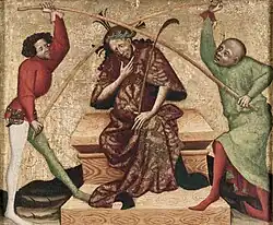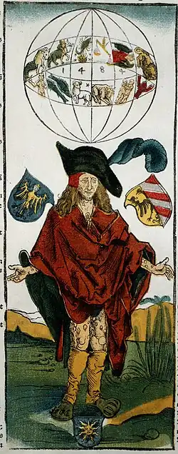 The earliest known depiction of an individual with syphilis is Albrecht Dürer's Syphilitic Man (1496), a woodcut believed to represent a Landsknecht, a Northern European mercenary.[93] The myth of the femme fatale or "poison women" of the 19th century is believed to be partly derived from the devastation of syphilis, with classic examples in literature including John Keats' La Belle Dame sans Merci.[94][95] Poet Sebastian Brant in 1496 wrote a poem titled De pestilentiali Scorra sive mala de Franzos which explains the spread of the disease across the European continent.[96] Brant also created artistic creations showing religious and political views of syphilis, especially with a work showing Saint Mary and Jesus throwing lightning to punish or cure those afflicted by syphilis, and he also added Holy Roman Emperor Maximilian I in the work, being rewarded by Mary and Jesus for his work against the immoral disease, to show the strong relationship between church and state during the 16th and 17th centuries.[61]