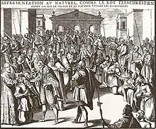 Initially, the touching ceremony was an informal process. Sickly individuals could petition the court for a royal touch and the touch would be performed at the King's earliest convenience. At times, the King of France would touch affected subjects during his royal walkabout. The rapid spread of tuberculosis across France and England, however, necessitated a more formal and efficient touching process. By the time of Louis XIV of France, placards indicating the days and times the King would be available for royal touches were posted regularly; sums of money were doled out as charitable support.[42][43] In England, the process was extremely formal and efficient. As late as 1633, the Book of Common Prayer of the Anglican Church contained a Royal Touch ceremony.[44] The monarch (king or queen), sitting upon a canopied throne, touched the affected individual, and presented that individual with a coin – usually an Angel, a gold coin the value of which varied from about 6 shillings to about 10 shillings – by pressing it against the affected's neck.[42]