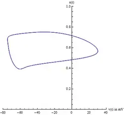 Because there are four state variables, visualizing the path in phase space can be difficult. Usually two variables are chosen, voltage and the potassium gating variable , allowing one to visualize the limit cycle. However, one must be careful because this is an ad-hoc method of visualizing the 4-dimensional system. This does not prove the existence of the limit cycle.