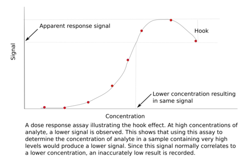 The hook effect refers to the prozone phenomenon, also known as antibody excess, or the postzone phenomenon, also known as antigen excess. It is an immunologic phenomenon whereby the effectiveness of antibodies to form immune complexes can be impaired when concentrations of an antibody or an antigen are very high. The formation of immune complexes stops increasing with greater concentrations and then decreases at extremely high concentrations, producing a hook shape on a graph of measurements. An important practical relevance of the phenomenon is as a type of interference that plagues certain immunoassays and nephelometric assays, resulting in false negatives or inaccurately low results. Other common forms of interference include antibody interference, cross-reactivity and signal interference. The phenomenon is caused by very high concentrations of a particular analyte or antibody and is most prevalent in one-step (sandwich) immunoassays