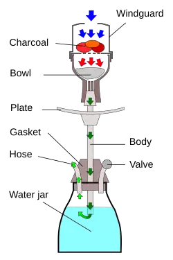 As a result of suction through the hose, a vacuum is created in the headspace of the water bowl sufficient to overcome the small static head of the water above the inlet pipe, causing the smoke to bubble into the bowl. At the same time, air is drawn over and heated by the coals. It then passes through the tobacco mixture where due to hot air convection and thermal conduction from the coal, the mainstream aerosol is produced.[104] The vapor is passed down through the body tube that extends into the water in the jar. It bubbles up through the water, losing heat, and fills the top part of the jar, to which the hose is attached. When a user inhales from the hose, smoke passes into the lungs, and the change in pressure in the jar pulls more air through the charcoal, continuing the process. Vapour that has collected in the bowl above the waterline may be exhausted through a purge valve, if present. This one-way valve is opened by the positive pressure created from gently blowing into the hose.