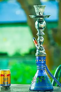 A hookah (also see other names),[1][2][3] shisha,[3] or waterpipe[3] is a single- or multi-stemmed instrument for heating or vaporizing and then smoking either tobacco, flavored tobacco (often muʽassel), or sometimes cannabis, hashish and opium.[3] The smoke is passed through a water basin—often glass-based—before inhalation.[3][4][5][6][7]