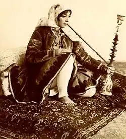Although the Safavid Shah ʿAbbās I strongly condemned tobacco use, towards the end of his reign smoking ḡalyān and čopoq had become common on every level of the society, women included. In schools, both teachers and students had ḡalyāns while lessons continued.[67] Shah Safi of Persia (r. 1629–42) declared a complete ban on tobacco, but the income received from its use persuaded him to soon revoke the ban.[68] The use of ḡalyāns became so widespread that a group of poor people became professional tinkers of crystal water pipes. During the time of Abbas II of Persia (r. 1642–1666), use of the water pipe had become a national addiction.[69] The shah (king) had his own private ḡalyān servants. Evidently the position of water pipe tender (ḡalyāndār) dates from this time. Also at this time, reservoirs were made of glass, pottery, or a type of gourd. Because of the unsatisfactory quality of indigenous glass, glass reservoirs were sometimes imported from Venice.[70] In the time of Suleiman I of Persia (r. 1694–1722), ḡalyāns became more elaborately embellished as their use increased. The wealthy owned gold and silver pipes. The masses spent more on ḡalyāns than they did on the necessities of life.[71]