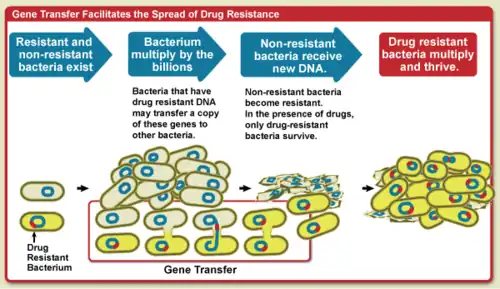 Through research into the growing issue of antibiotic resistance[120] certain compounds have been observed to promote horizontal gene transfer.[121][122][123][124] Antibiotics given to bacteria at non-lethal levels have been known to be a cause of antibiotic resistance[124] but emerging research is now showing that certain non-antibiotic pharmaceuticals (ibuprofen, naproxen, gemfibrozil, diclofenac, propranolol, etc.) also have a role in promoting antibiotic resistance through their ability to promote horizontal gene transfer (HGT) of genes responsible for antibiotic resistance. The transfer of antibiotic resistance genes (ARGs) through conjugation is significantly accelerated when donor cells with plasmids and recipient cells are introduced to each other in the presence of one of the pharmaceuticals.[121] Non-antibiotic pharmaceuticals were also found to cause some responses in bacteria similar to those responses to antibiotics, such as increasing expression of the genes lexA, umuC, umuD and soxR involved in the bacteria's SOS response as well as other genes also expressed during exposure to antibiotics.[121] These findings are from 2021 and due to the widespread use of non-antibiotic pharmaceuticals, more research needs to be done in order to further understanding on the issue.[121]