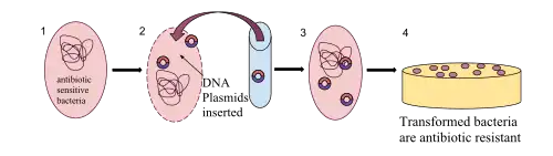 - Transformation, the genetic alteration of a cell resulting from the introduction, uptake and expression of foreign genetic material (DNA or RNA).[41] This process is relatively common in bacteria, but less so in eukaryotes.[42] Transformation is often used in laboratories to insert novel genes into bacteria for experiments or for industrial or medical applications. See also molecular biology and biotechnology.