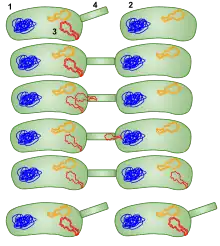 - Bacterial conjugation, a process that involves the transfer of DNA via a plasmid from a donor cell to a recombinant recipient cell during cell-to-cell contact.[41]