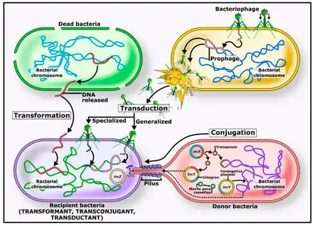 - ↑ 70.0 70.1 Johnsborg O, Eldholm V, Håvarstein LS (December 2007). "Natural genetic transformation: prevalence, mechanisms and function". Research in Microbiology. 158 (10): 767–78. doi:10.1016/j.resmic.2007.09.004. PMID 17997281.