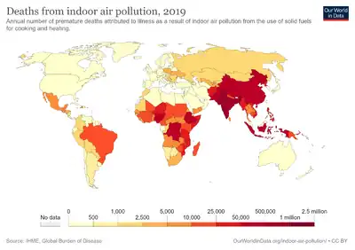 3. Ritchie, Hannah; Roser, Max (2019). "Access to Energy". Our World in Data. Archived from the original on 1 November 2021. Retrieved 1 April 2021. According to the Global Burden of Disease study 1.6 million people died prematurely in 2017 as a result of indoor air pollution ... But it's worth noting that the WHO publishes a substantially larger number of indoor air pollution deaths..