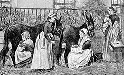 In 19th-century Ireland, foundlings from Dublin were "sent to the mountains of Wicklow, to feed upon the goats' milk. As the children grew older, the goats came to know them, and became very tame; so that the infant sought the goat, and was suckled by it as he would have been by a human wet nurse. These children throve remarkably well."[14] Donkeys were preferred in England; as one writer has put it, "nothing was more picturesque than the spectacle of babies, held under the bellies of the donkeys in the stable adjoining the infants' ward, sucking contentedly the teats of the docile donkeys."[9] Ancient Greek and Roman physicians including Galen, Aretaeus, Hipposcrates, and Alexander of Tralles believed that donkey milk was a superior treatment for human illness and an antidote for poisons.[15] In Brittany, attempts were made around 1900 to employ sows as wet nurses but foundered due to opposition to the use of pigs for this purpose.[16]