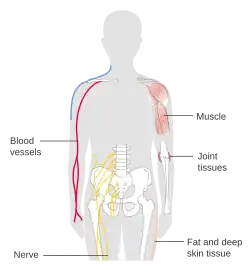 The body consists of many different types of tissue, defined as cells that act with a specialised function.[9] The study of tissues is called histology and is often done with a microscope. The body consists of four main types of tissues. These are lining cells (epithelia), connective tissue, nerve tissue and muscle tissue.[10]
